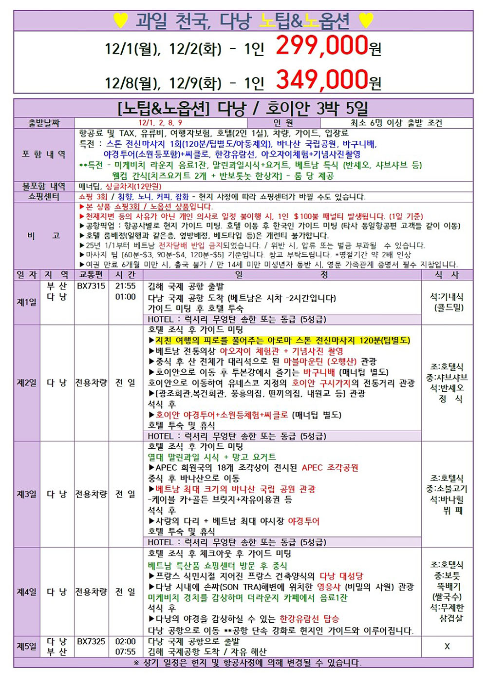베트남 다낭 노팁 노옵션 3박5일 25년 12월 패키지