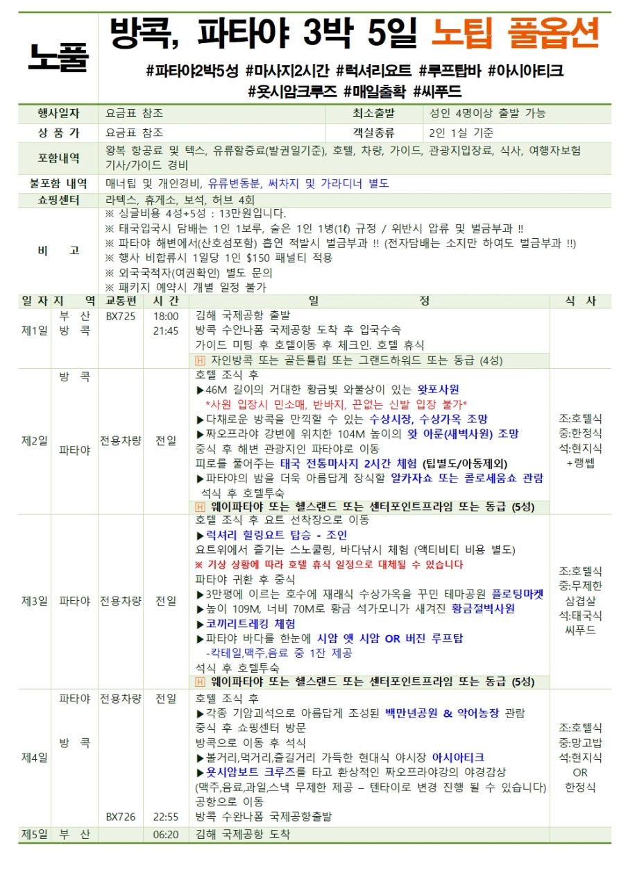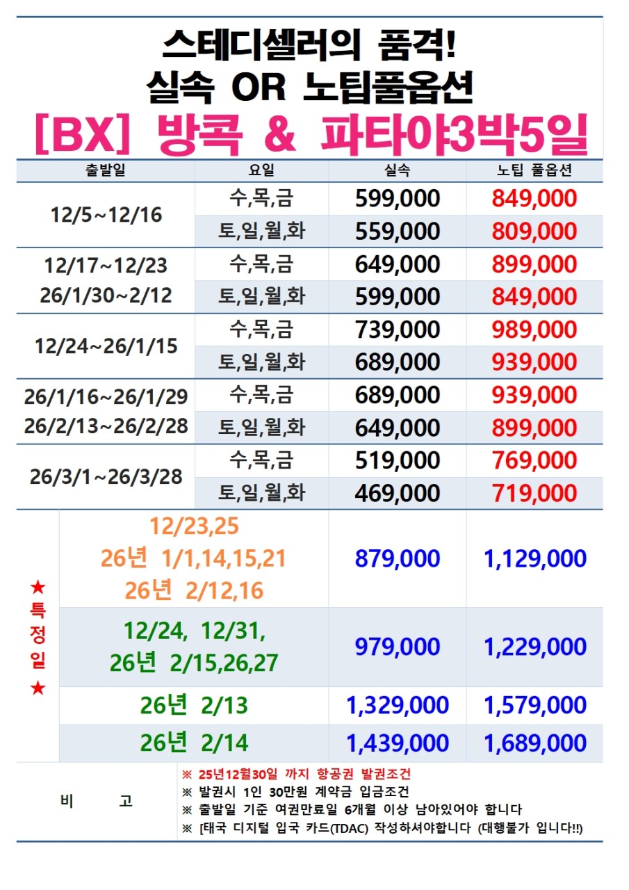 스테디셀러 방콕&파타야 3박 5일(~12/30까지발권조건)