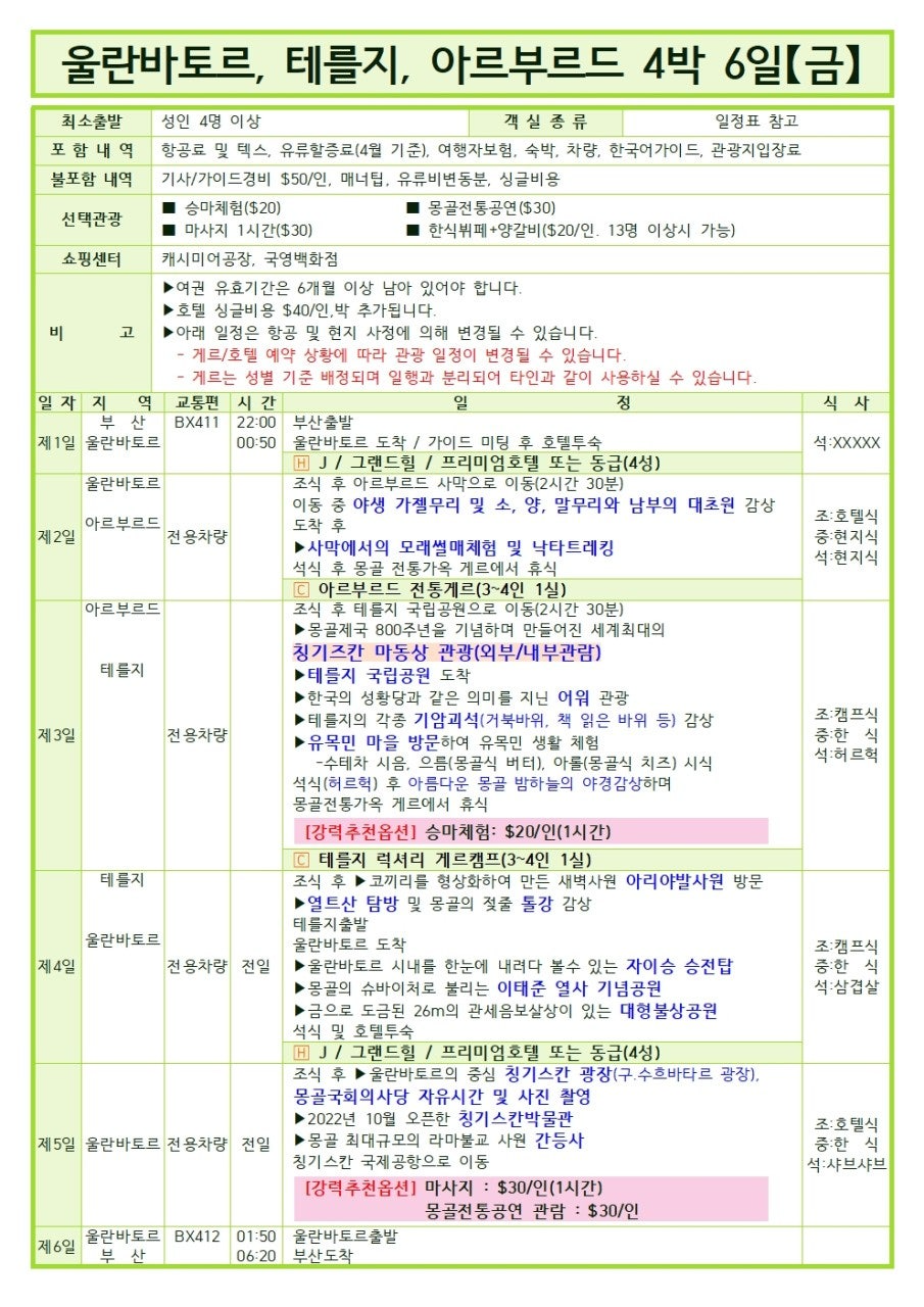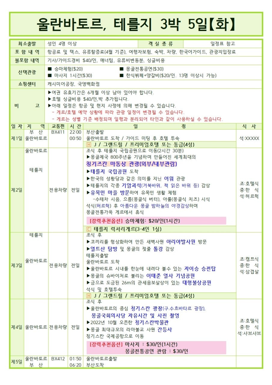 1.상기 상품은 여러 손님들이 같이 일정을 진행하는 단체관광객을 위한 상품입니다. 자유여행/개별일정/개별활동 여행객은 반드시 자유여행상품 예약해주세요.