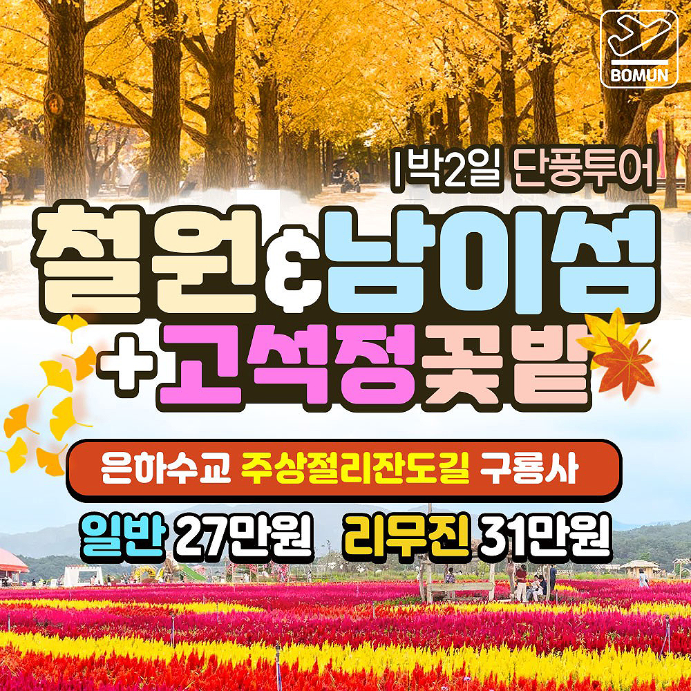 🌈보문여행사와 떠나는 2025 단풍여행철원+남이섬 낭만투어 1박2일한탄강 주상절리잔도길 + 남이섬 + 고석정 꽃밭📆집중모객 : 2025년 11월 1일(토)매주 화,목,토 모집으로 이외날짜 문의주세요^^💜회비 |일반(44인승) : 27만원리무진(28인승) :31만원💜포함사항 | 왕복차량비(차량보험포함), 기사&인솔자 봉사료, 입장료,떡, 과일, 간식꾸러미, 생수 등💜불포함사항 | 개인경비, 여행자보험🚍2025 단풍은 남이섬으로~가을의 남이섬은 사계절 중 가장 낭만적인 풍경을 자랑하는 시기입니다. 단풍과 은행잎이 절정을 이루며 섬 전체가 붉고 노란 물결로 물드는 모습은 한 폭의 그림 같습니다. 🍁