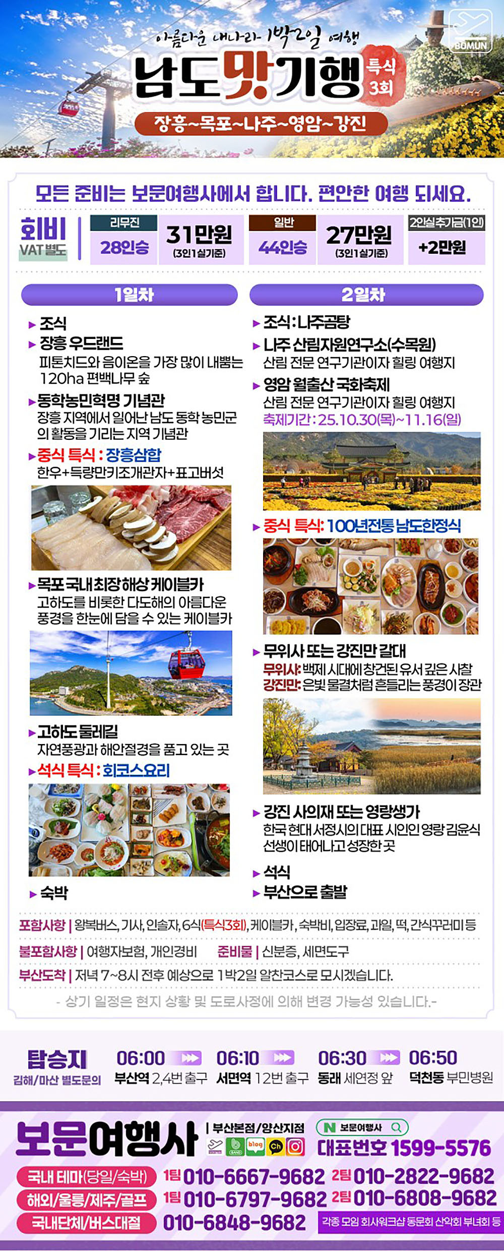 🌈보문여행사와 떠나는남도맛기행 1박2일장흥~목포~강진~보성❤️모객날짜 : 매주 화,목,토 모집중~ ! 원하시는 날짜는 문의주세요^^ 💜회비(2인1실) :리무진(우등) 28인승 31만원일반(44인승) 27만원💜여행 일정1일차: 장흥 우드랜드 > 동학농민혁명기념관 > 목포해상케이블카 > 고하도둘레길2일차: 나주 산림자원연구소 > 영암 월출산 국화축제 > 무위사 또는 강진만갈대 > 사의재 또는 영랑생가💙1박2일 특식3회✔️ 특식1 : 장흥삼합 (한우+득량만키조개관자+표고버섯)✔️ 특식2 : 회코스요리✔️ 특식3 : 100년전통 남도 한정식💛 포함사항 |왕복버스비, 기사, 인솔자, 6식(특식3회), 숙박비, 케이블카, 입장료, 과일, 떡, 간식꾸러미, 생수등💚 불포함사항 |여행자보험, 개인경비