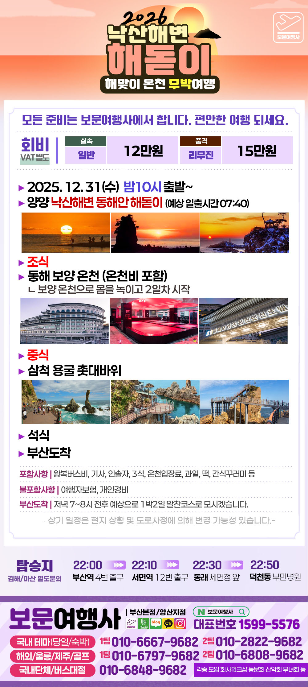 🌈보문여행사와 떠나는🌟 낙산해변 해돋이 🌟무박2일<<일정>>양양 낙산해변 동해안 해돋이 > 동해 보양 온천 > 삼척 용굴 촛대바위📢 출발일 : 2025년 12월 31일 (수) 밤 10시 출발~📢포함사항 : 왕복버스비, 기사, 인솔자, 3식, 온천입장료, 과일, 떡, 간식꾸러미, 생수 등