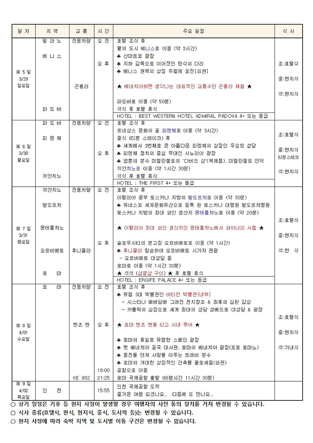 3.현지 사정(천재지변등 포함)에 의한 일정변경 가능성이 있습니다.(가이드의 일정 변경 동의서 작성필요)